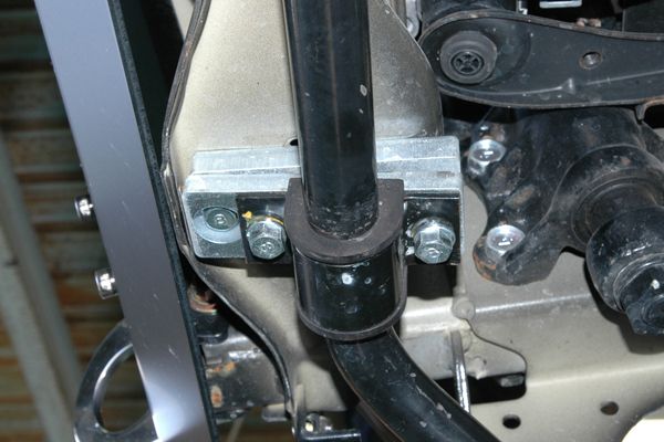 スタビライザーステーを、付属の短いボルトを使用して固定してください。この状態でボルトの増し締めを終えると、ノーマル車と比較し21mmダウン&20mm後方オフセットの状態になり、車高アップを施した車両でも、スタビライザーが引っ張られた状態になりにくく仕上がります。